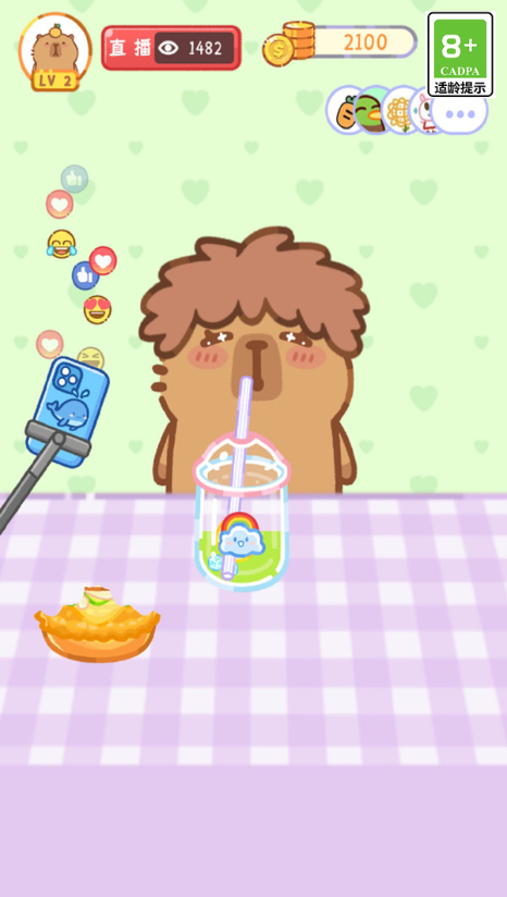 3、成为可爱又贪吃的卡皮巴拉主播,展开一场场令人捧腹的吃播大冒险。