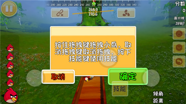 4、中间的按钮就可是用来控制小鸟的啦,按住即可拖拽小鸟进行攻击,玩家还可以按下技能按钮进行技能的使用。