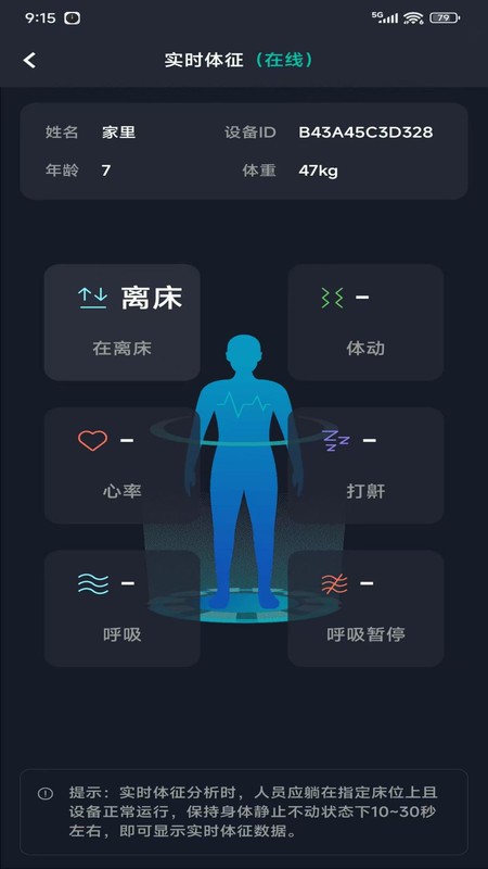 2、实时监测界面,呼吸、心率数据动态呈现,身体变化一手掌握,秒速进行对比。