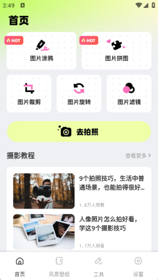 1、在首页中提供图片涂鸦、图片拼图、图片裁剪、图片旋转、图片滤镜,去拍照,在及摄影教程内容;