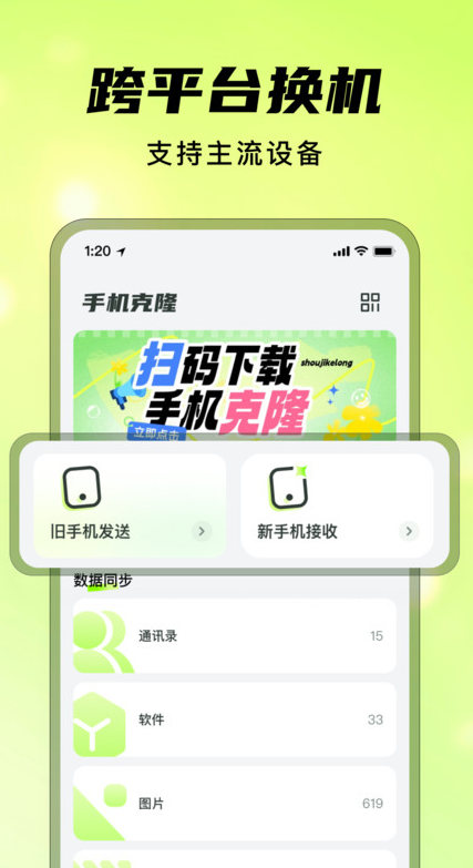 2、进入一键换机板块,大家可以轻松实现旧手机发送,新手机接受,数据同步不复杂。