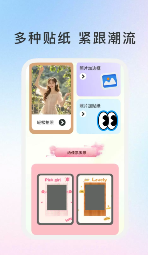 3、精心设计的潮流贴纸库和多款照片边框,轻松营造氛围感,满足个性化装饰需求。