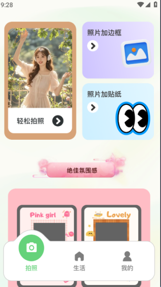 2、首页中提供各种拍照功能,支持给照片添加贴纸边框。