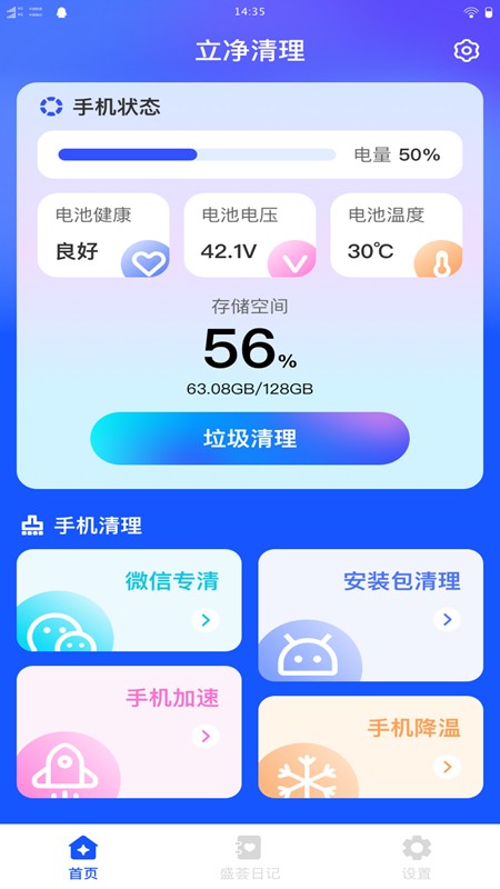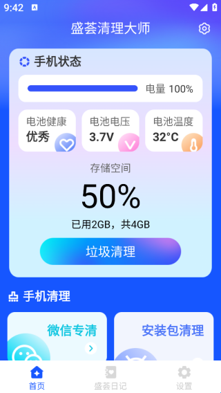 盛荟清理大师是一个手机清理神器,还在为手机空间不足、卡顿的问题烦恼?有了它就不用担心了,该软件除了能帮你高效清理手机里的垃圾,轻松释放内存外,还配备微信、安装包专清服务,满足不同用户的使用需求,另外,用户还能随时来这记录日常。