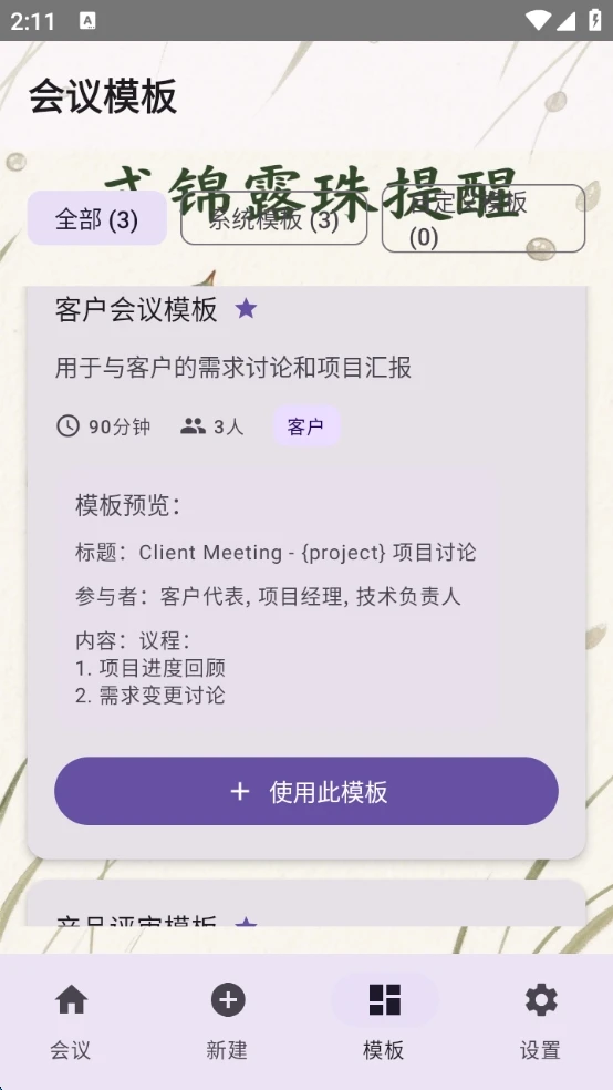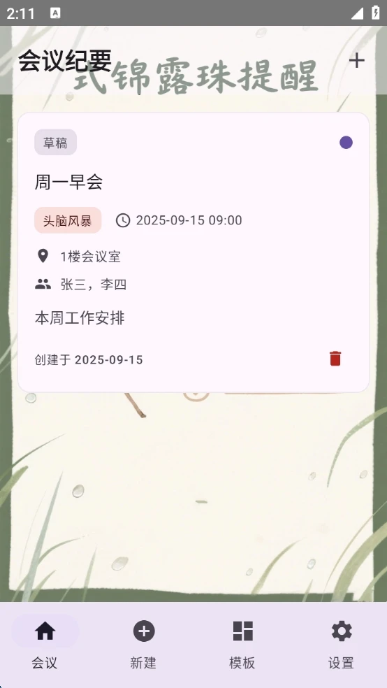 式锦露珠提醒是一款好用的会议纪要工具,用户可以自由编辑各类形式的会议纪要,也可以直接使用内置的各类模版编辑。