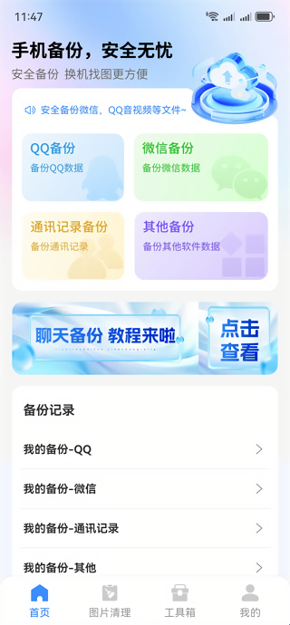2、可以进行QQ备份、微信备份、通讯录备份、其他备份,满足多种备份需求;