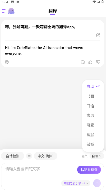 可设置翻译语气,例如:书面、口语、文艺、中国古风。