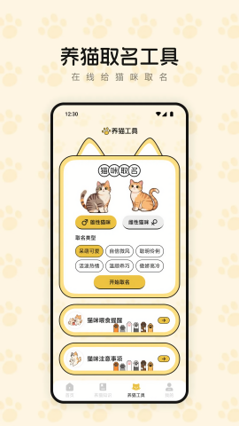 4、在养猫工具中有猫咪取名、猫咪喂食提醒、猫咪注意事项,猫咪语音等功能。