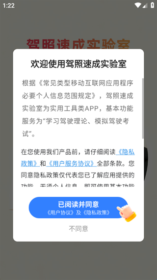 1、阅读隐私政策和用户服务协议之后点击已阅读并同意;