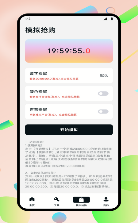 2、设置抢购模拟:进入抢购模拟板块,输入目标抢购时间,设置倒计时参数,启动后悬浮时钟会实时显示剩余时间,帮助用户精准把握抢购时机,做好准备。