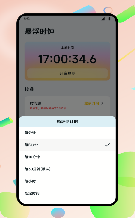 1、开启悬浮时钟:打开app后找到悬浮时钟功能,点击开启按钮,软件会自动同步系统时间并显示悬浮时钟,用户可根据需求设置循环倒计时,随时查看变化。
