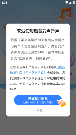 1、这款铃声软件的用户协议是需要大家一起来点击同意的;