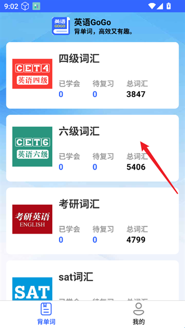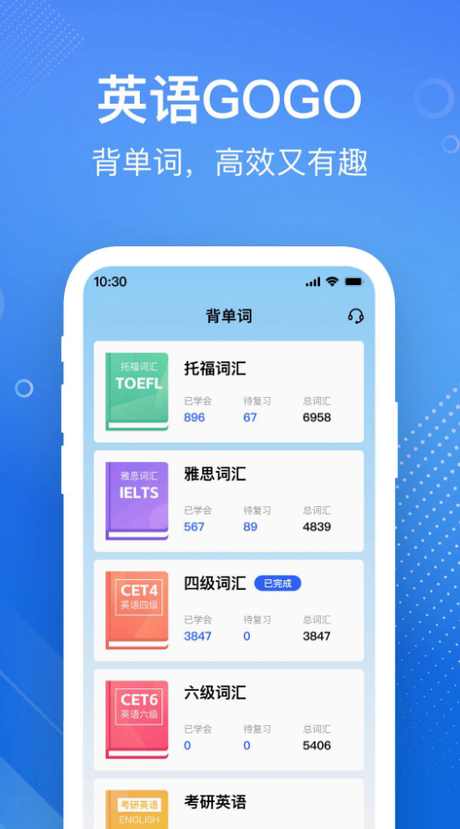 英语GoGo是一个英语学习软件,该软件专注于提供单词学习服务,托福、雅思、四六级、考研等词汇一应俱全,大家可自由选择进行学习,并且软件采用了艾宾浩斯记忆算法,帮助大家更好的记忆,还能免去背了就忘的烦恼,更有多种训练模式可以强化大家的记忆。