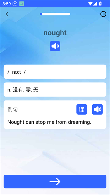 3、进入后即可开始记单词了,可以从发音、译义和例句三个方面记忆。