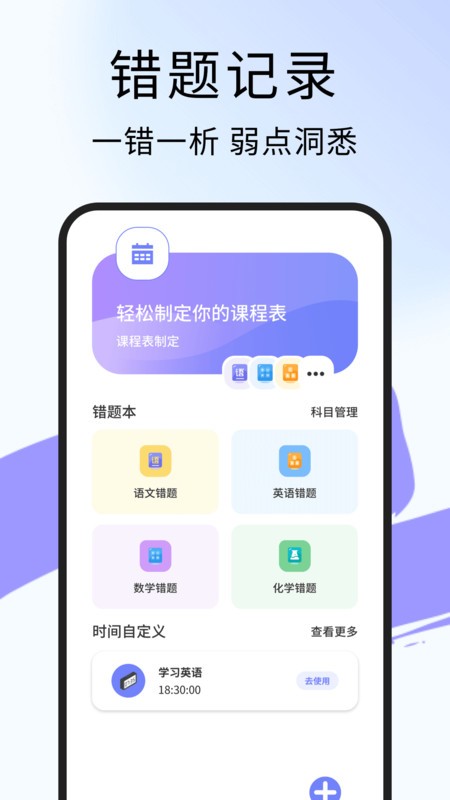 3、在学习页面中可以轻松制作你的课程表,同时有错题本以及时间自定义功能;