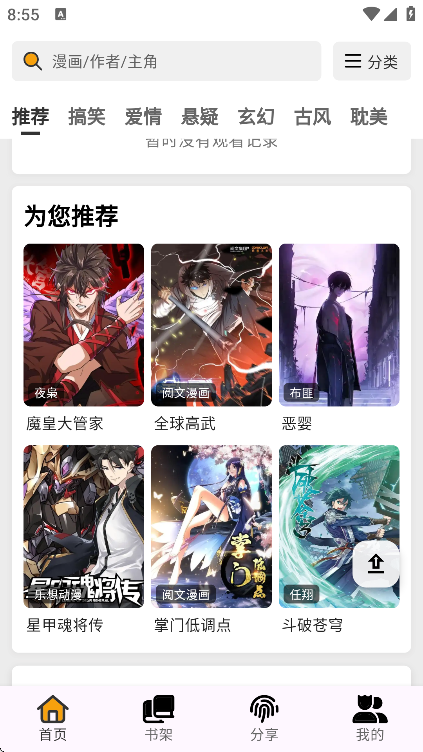 2、多种分类:用户可以根据自己的兴趣选择不同的漫画分类进行阅读,包括爱情、冒险、奇幻、恐怖等;