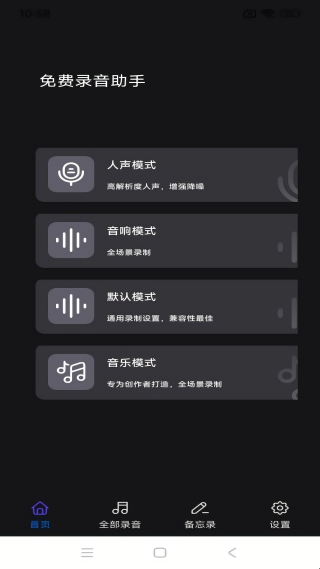 免费一键录音器,这是一个非常便捷的录音软件,你可以使用软件随时随地录制需要的音频内容哦,同时提供多种录音模式,满足大家不同场景的使用需求,当然,用户录制的所有音频软件都能进行存储,更有备忘提醒服务,避免忘记重要事情。