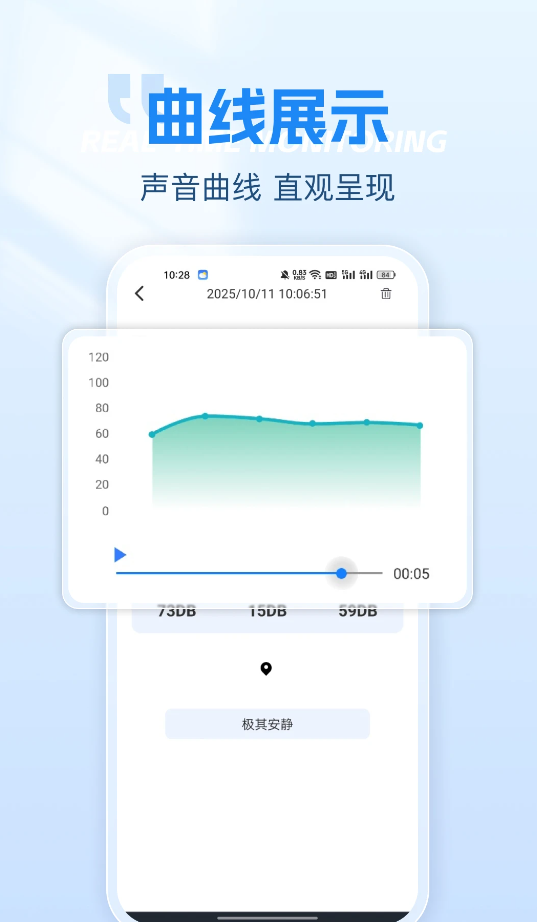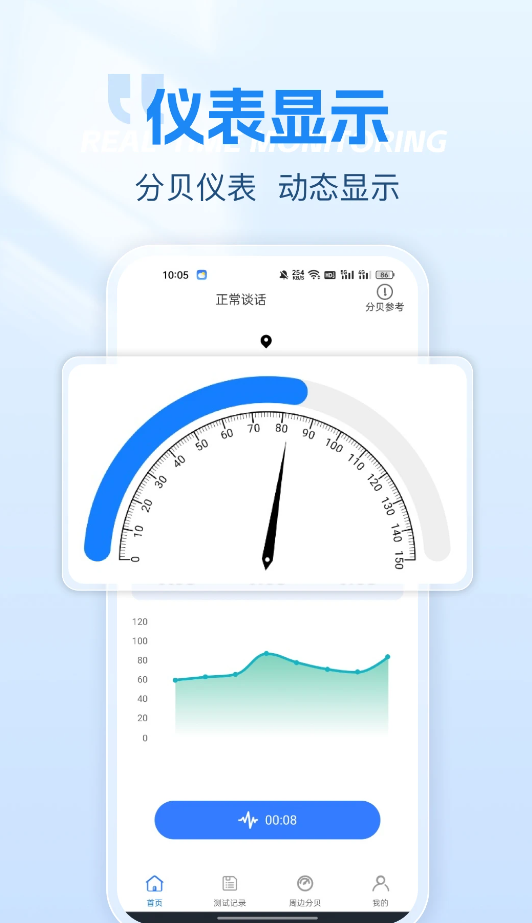 欢迎体验测噪音分贝仪app!顾名思义,这是一个专注于检测噪音分贝的手机工具,有了它,用户就能随时随地测量日常生活中的噪音水平,提供的信息非常详细哦,测试记录也会全面保存,方便日后随时进行查询,软件界面简洁,操作也非常简单!