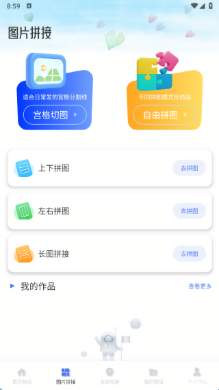 2、在图片拼接页面中有宫格切图、自由拼图以及上下拼图、左右拼图和长图拼接;