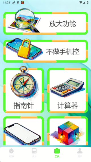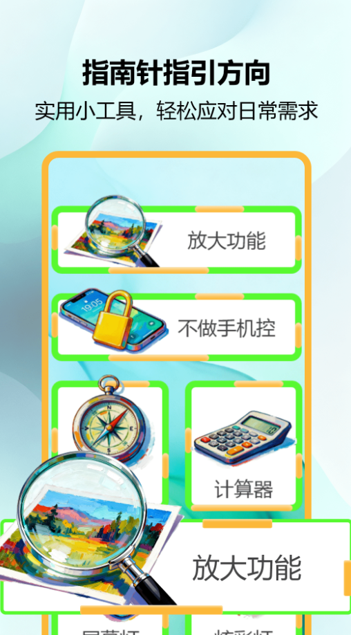 4、在工具中有放大功能、不做手机控、指南针、计算器、屏幕灯以及炫彩灯等功能。
