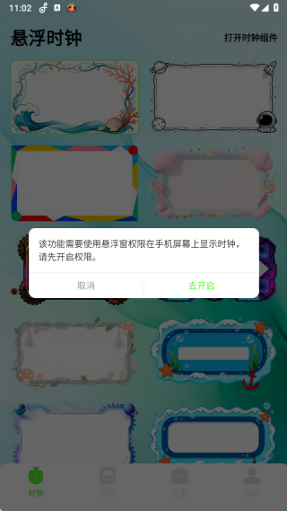 2、点击右上角的打开时钟组件,可以开启悬权窗的权限进行使用;