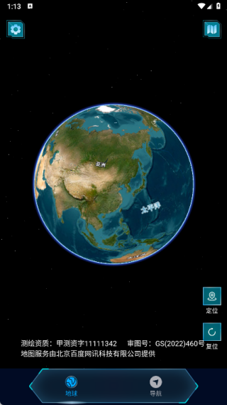 3、进入到地球页面中可以进行定位进行查看各类地点,同时可以一键复位;