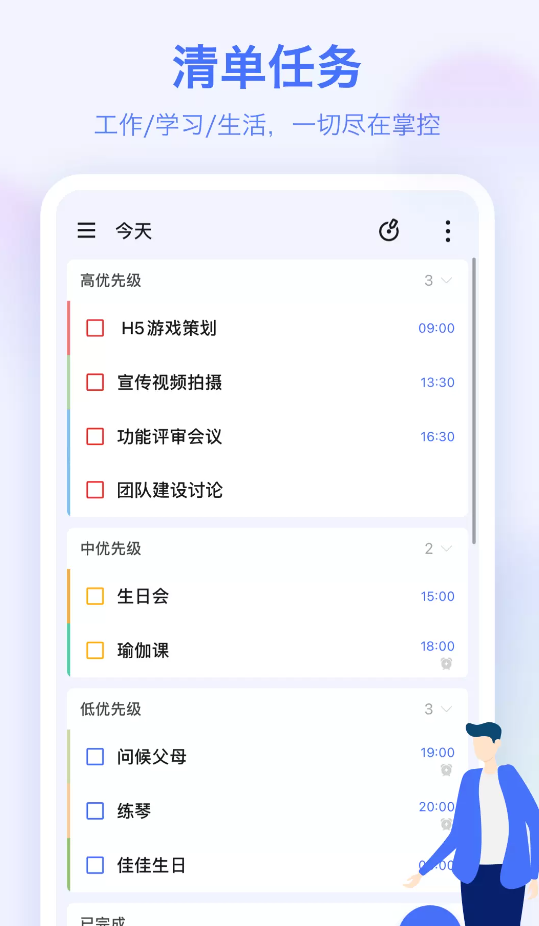 多端同步:在手机、平板、网页等多个设备云同步,随时随地查看日程安排和备忘事项;