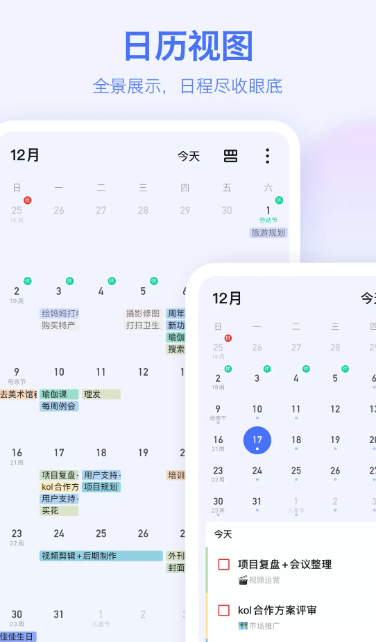 新增节假日日历:现在支持订阅各个国家/地区的节假日日历。订阅后,节假日将显示在侧边栏、今日清单和日历视图中,随时查看更方便。前往“设置 >关联与导入 >日历 >添加日历”,选择节假日即可。