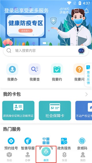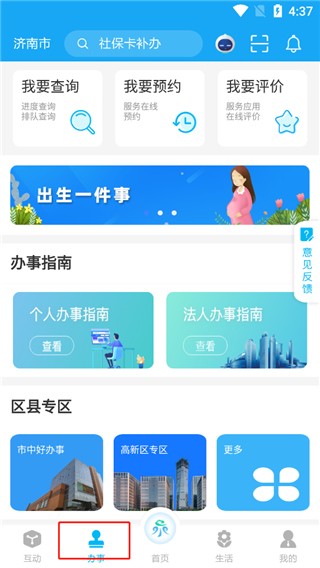 1、打开在本站下载的软件,点击进入首页,我们可以看到有我要办、我要问、我要查等等功能;