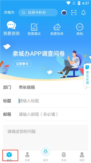2、点击互动,用户可以填写建议或举报发送给你想要的部门;
