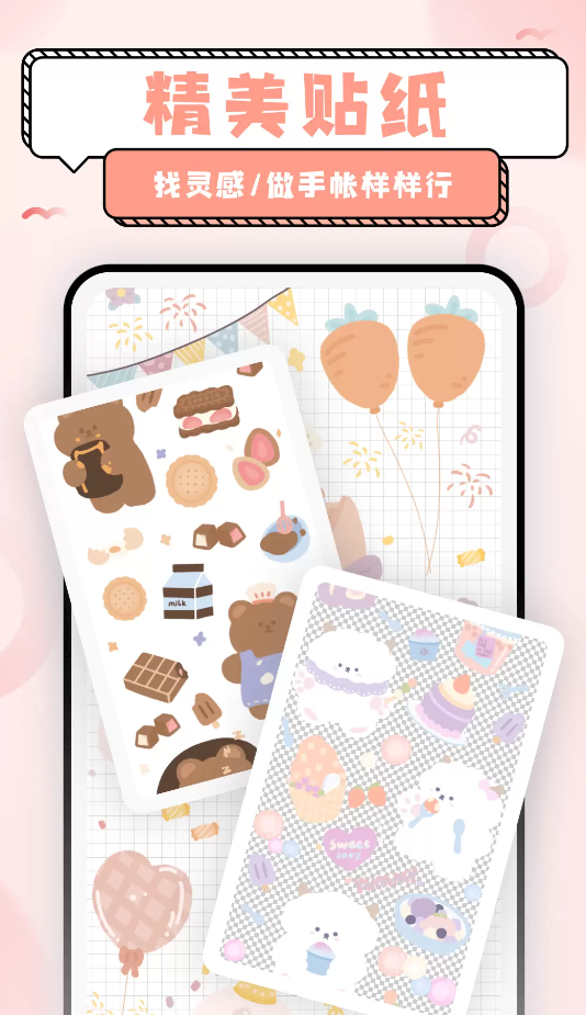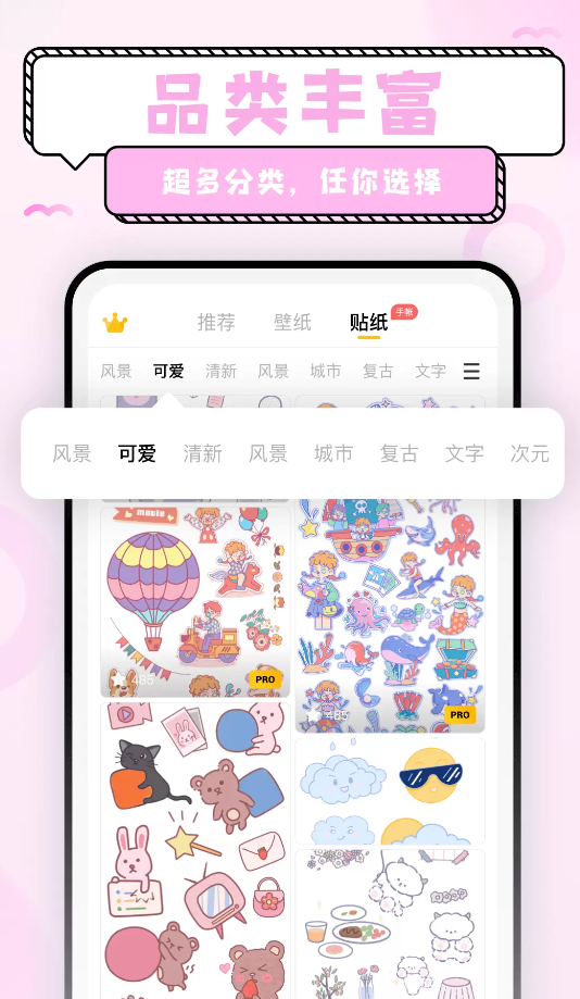 1、下载安装超萌鸭app,进入首页大家可以看到推荐、贴纸、壁纸等功能,要做手账的朋友可以使用这里的贴纸;