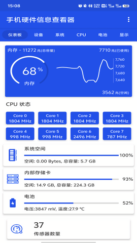 手机硬件信息查看器是一款专为手机性能查看打造的软件,这款app可以直接查看到用户手机的各项性能参数以及内存状况,可以帮助用户直观的了解自己手机的构成搭配,操作起来非常的简单,新手也可以快速上手,满足大家的需求。