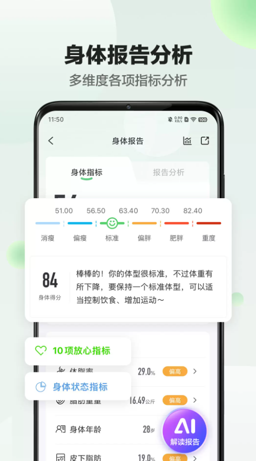 2、十七项数据:连接体脂称检测身体17项健康数据,全面了解自己
