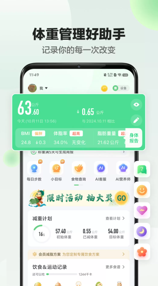 1、体重记录:手动记录体重,定期分析体重数据变化,你的贴心体重小助手