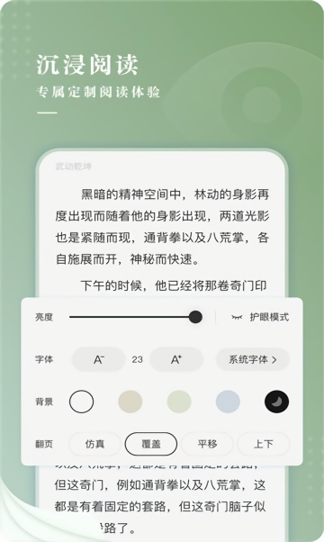 3、沉浸式阅读,界面可自定义,操作方便,多种皮肤主题可选择。