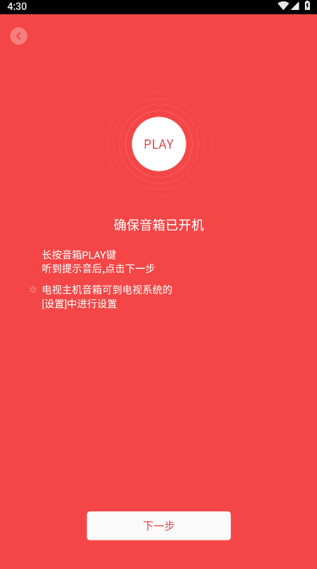 6.长按音箱PLAY键,听到提示音点击下一步,电视主机音箱可到电视系统的【设置】中进行设置